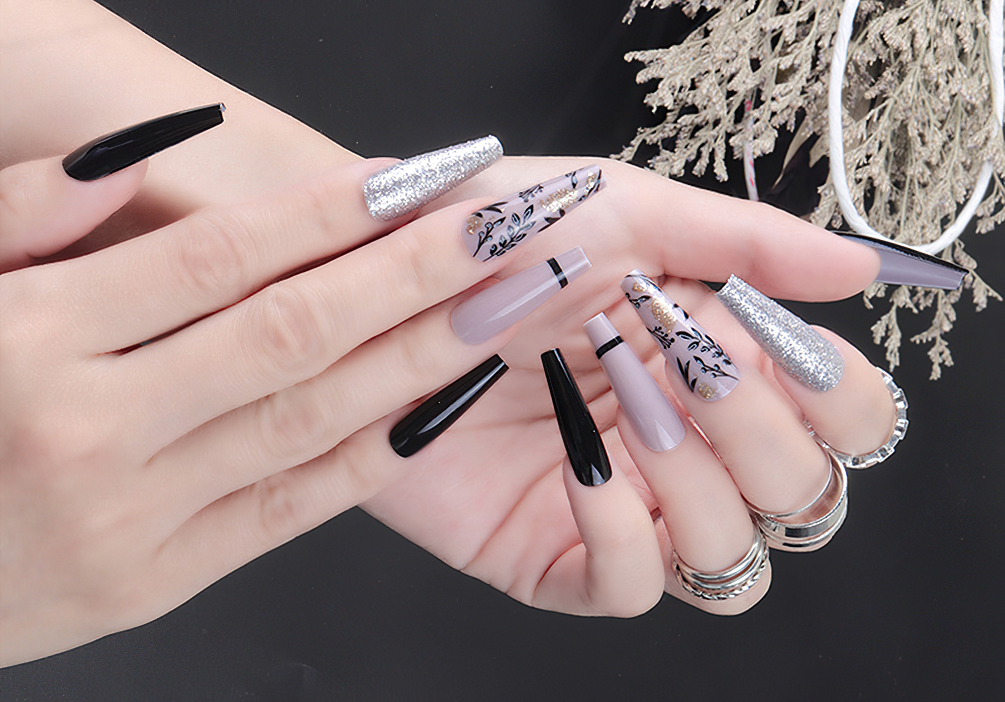Glitter pink silver leaves press on false nails